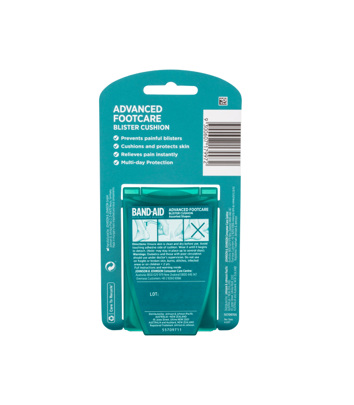 Advanced footcare blister cushion assorted contains hydrocolloid technology which relieves blister pain on your feet instantly and comes in assorted shapes. They can also be used to prevent painful blisters from forming, as it cushions and protects the skin providing a multi-day protection.