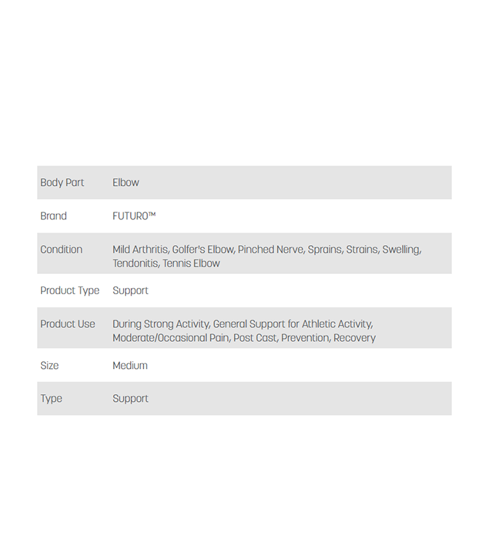 Low profile and flexible, the FUTURO™ Compression Basics Elbow Support gives you the support you need without the bulk. Its flexible and breathable fabric provides immediate compression and keeps you comfortable while you’re doing the activities you enjoy.