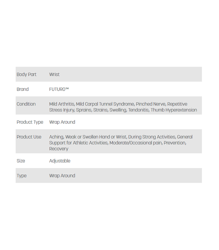 Whether you’re playing tennis, or need extra support at the gym, rely on the moderate comfort of the FUTURO™ Sport Wrist Support. Designed to provide customisable compression, this wrist brace wraps your wrist in durable Neoprene-blend material while providing heat retention to your injury. The thumb loop makes this wrist support super easy to put on and take off, and you can use it on either wrist. A minor wrist injury isn’t about to slow you down – so, reach for the moderate support of the FUTURO™ Sport Wrist Support and get considerable relief.