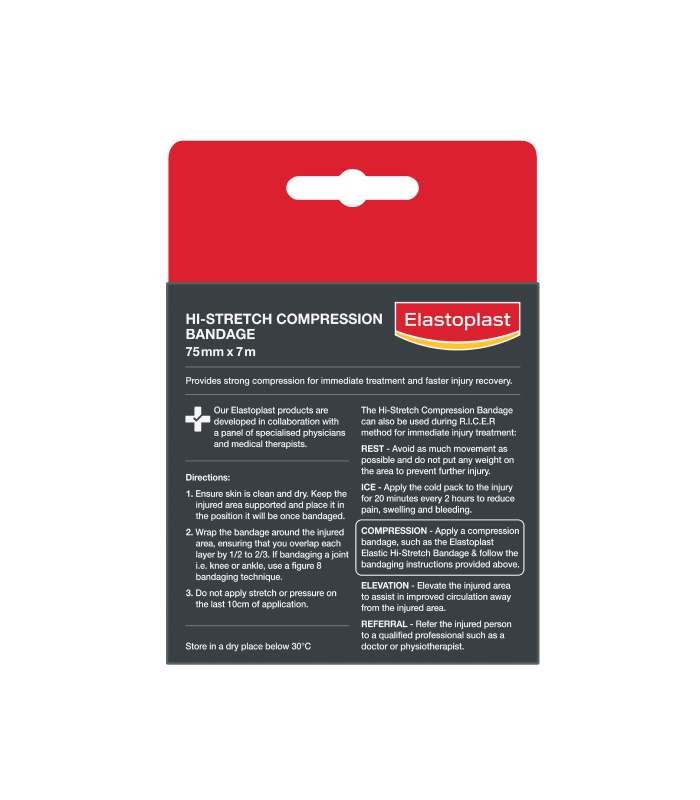 The Elastoplast Hi-Stretch Support and Compression Bandage is a highly elastic compression bandage, which offers good compression for soft tissue injury treatment. It can be used within the acute phases of soft tissue injuries, such as bruising, corked thighs or sprained ankles. The Hi-Stretch bandage is particularly useful in conjunction with the RICER technique.