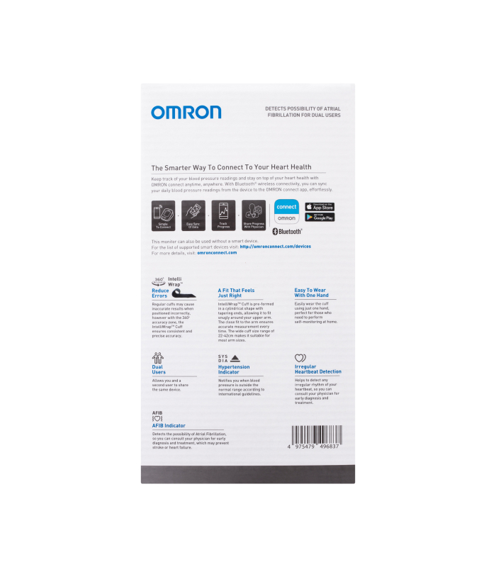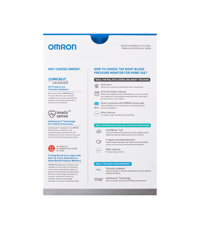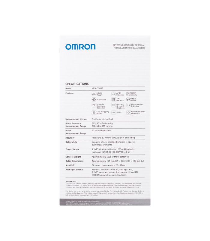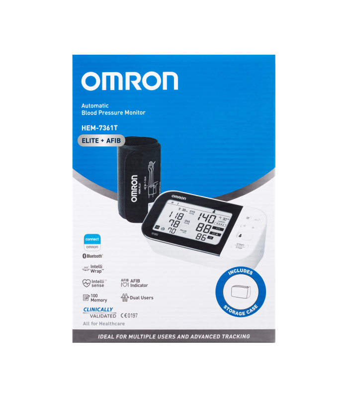 The Omron HEM7361T Advanced with AFIB Indicator Blood Pressure Monitor measures blood pressure and detects AFIB at the same time. This allows users to consult their doctor for early diagnosis and treatment, which may prevent stroke or heart failure. Designed with families in mind, the dual user function allows for the storage and transmission of measurement data of 2 separate users to their smartphones.