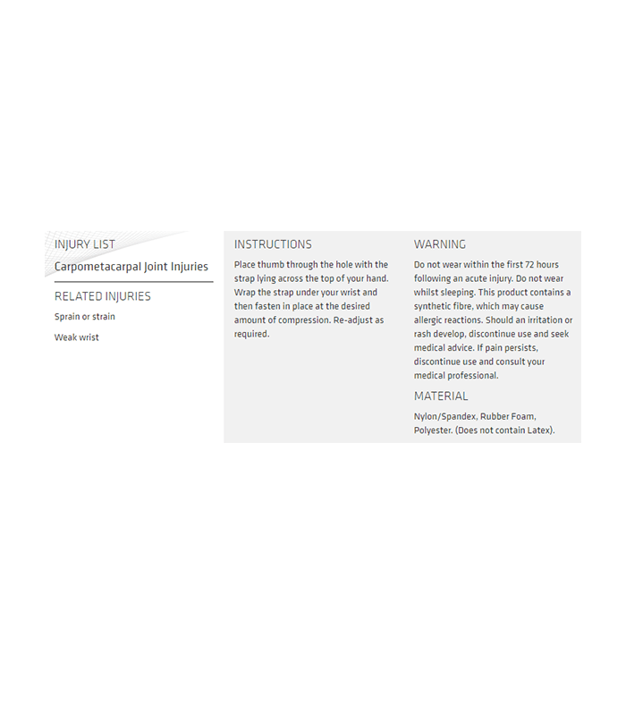 This Sport Adjustable Wrist Support provides compression, stabilising support, and warmth for the wrist during physical activity, and may be helpful in the treatment of carpometacarpal joint injuries, sprains, or strains.